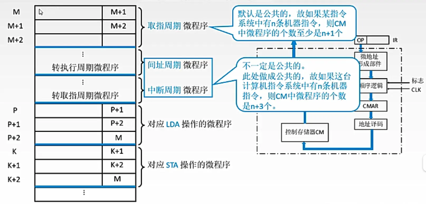 一条机器指令对应一个微程序。若指令系统具有n种机器指令则控制存储器中的微程序至少有n+1种。(1:公共的取址微程序)