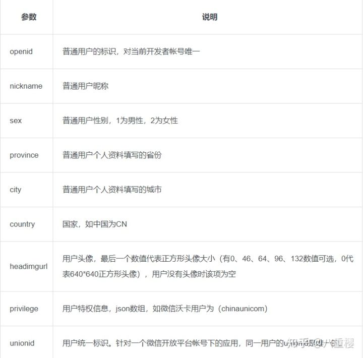 此接口用于获取用户个人信息。开发者可通过OpenID来获取用户基本信息。特别需要注意的是,如果开发者拥有多个移动应用、网站应用和公众帐号,可通过获取用户基本信息中的unionid来区分用户的唯一性,因为只要是同一个微信开放平台帐号下的移动应用、网站应用和公众帐号,用户的unionid是唯一的。换句话说,同一用户,对同一个微信开放平台下的不同应用,unionid是相同的。