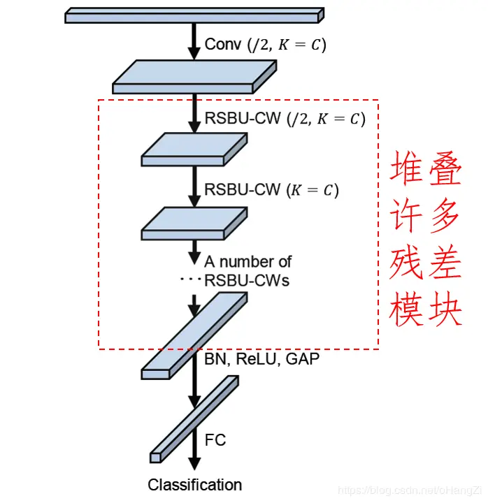 通过堆叠一定数量的基本模块,可以构成完整的深度残差收缩网络,如下图所示: