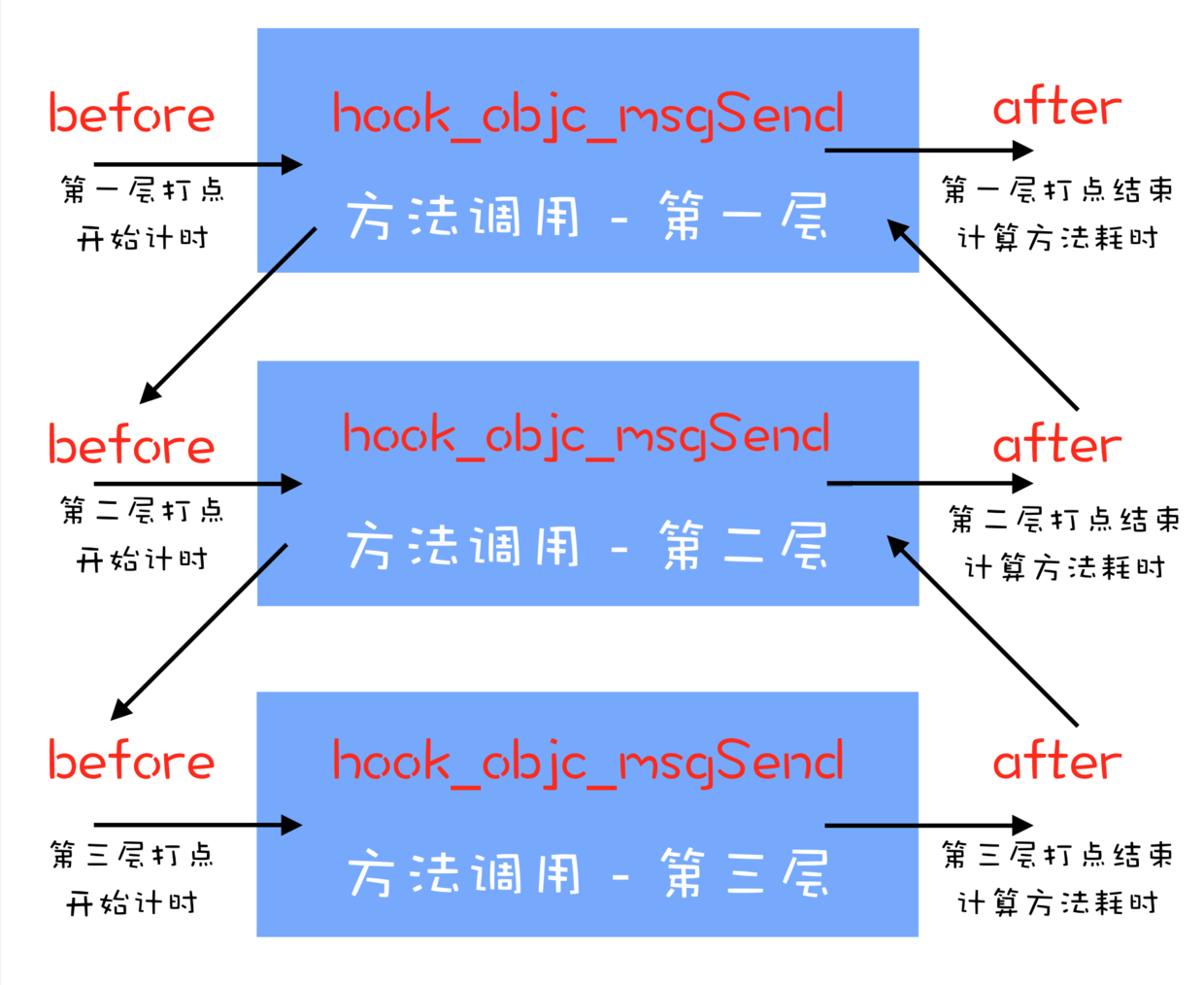 这时候,每当底层调用hook_objc_msgSend方法时,会先调用before_objc_msgSend方法,再调用hook_objc_msgSend方法,最后调用after_objc_msgSend方法。