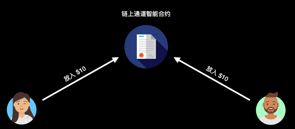 Alice和Bob分别向链上(Ethereum)通道智能合约存入$10作为保证金。然后再链下进行多次交易,每次交易可以看成一个白条。白条的信息分别为白条序号N,Alice签名,Bob签名,Alice和Bob的余额。多个链下交易瞬间无成本完成。