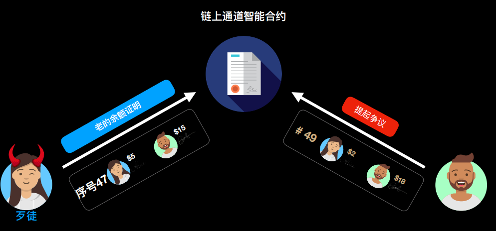 如果Alice是一个歹徒进行作恶,将旧的有利于自己的白条提交给链上通道智能合约进行结算,如白条序号47,此时就一个申诉期,用于对提交的白条证明进行申诉。链上通道智能合约对于提交的白条除了版本外,没什么区别,都有两人的签名认证,以及分发的余额。Bob发现Alice提交的是一个老的余额证明,于是将最新的白条提交给链上通道智能合约,合约就认定Bob提交的新的白条才是最终的余额证明,于是就按新的余额证明给两人分配。