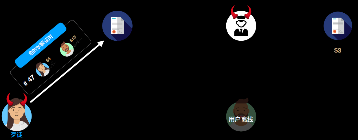 当歹徒Alice勾结了所有的守卫者,试图向链上合约提供老的余额证明,自然在每个守卫者的争议时段里都没有向链上合约提供新的余额证明的申诉,当离线后的Bob又重新上线了,发现在守卫者争议期间都没进行申诉,于是自己就向侧链的守卫者网络提交关于Alice的恶意结算证明