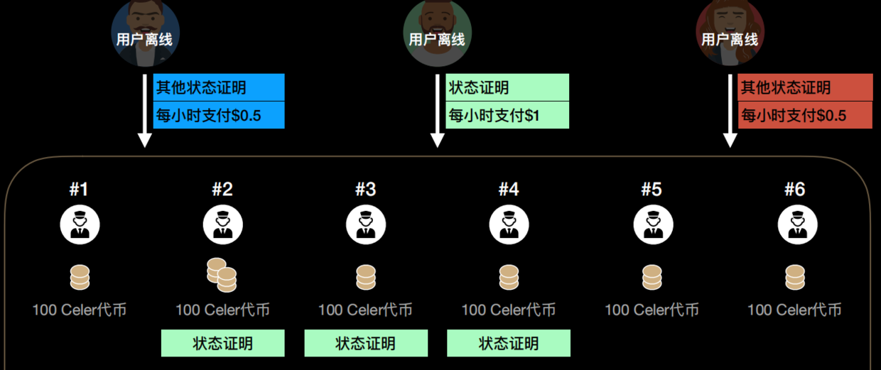 例如上图,每小时状态守卫者网络总支付费用为$2(0.5+1+0.5),其中Bob支付了每小时$1,所以能从状态守卫者网络的6个人中随机抽取3个人为Bob提供状态证明。如图中守卫者#2,#3,#4