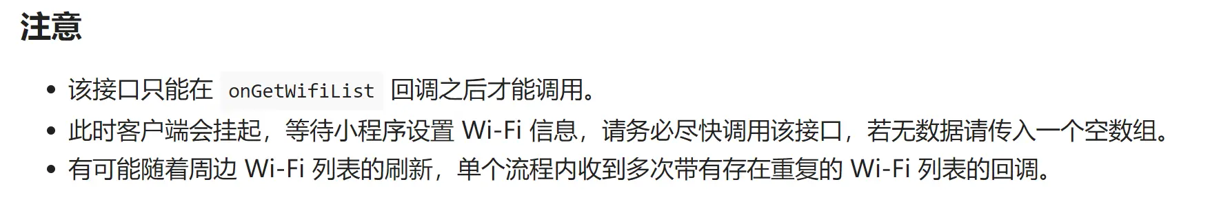 在小程序中,使用wifi模块都需要先调用wx.startWifi()来初始化wifi模块。以下能力的使用均需要在wx.startWifi的success回调中使用。
