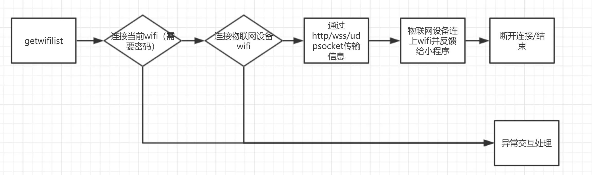 笔者在项目中接触到了使用小程序提供的硬件(wifi)能力的场景。利用wifi与socket的能力,我们可以为物联网设备连接wifi。流程如下: