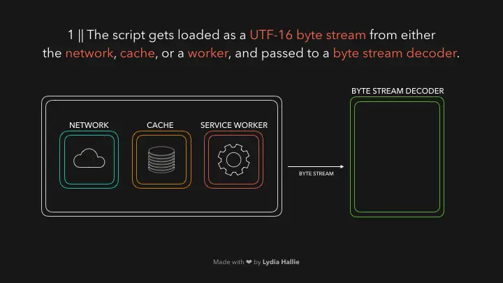 HTML解析器遇到带有源代码的script标签。 来自此源的代码从网络,缓存或已安装的服务工作程序中加载。 响应是将请求的脚本作为字节流,由字节流解码器负责。字节流解码器在下载字节流时对其进行解码。