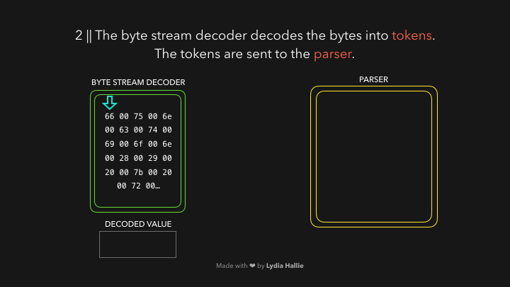 字节流解码器从已解码的字节流中创建令牌。例如,0066解码为f, 0075到u, 006e到n, 0063到c, 0074到t, 0069到i, 006f到o, 006e到n,后面跟一个空格。就像JS中的function,这是 JS 中的一个保留关键字,它会创建一个标记,并将其发送给解析器。对于字节流的其余部分也是如此。