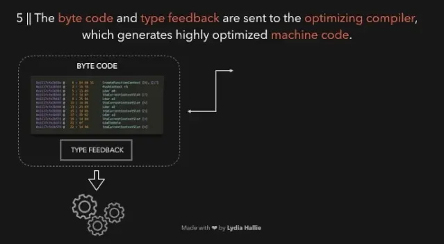 字节码与生成的类型反馈一起发送到优化编译器(ptimizing compiler)。 优化的编译器接收字节码和类型反馈,并根据这些信息生成高度优化的机器码。