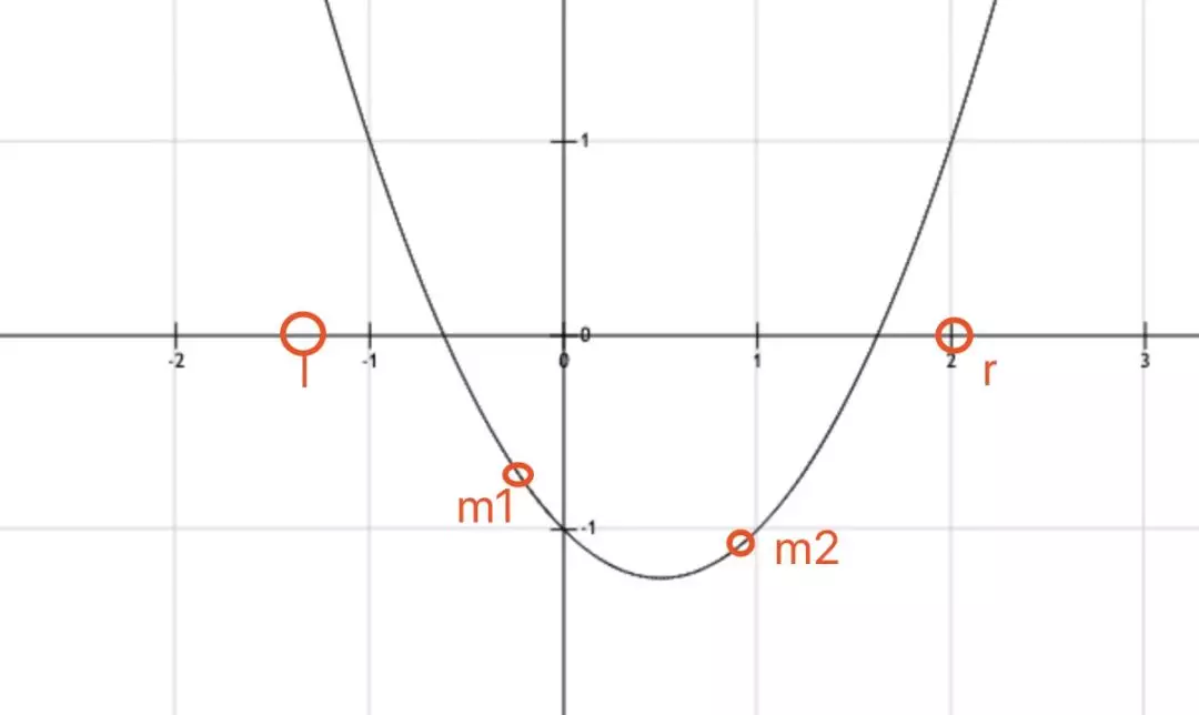 我们画出图像来看,这种情况其实并没有区别,我们只会抛弃区间[l, m1] ,并不会影响极值点。