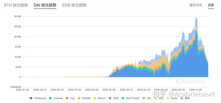 对比2019全年 ETH 和 Dai 锁仓趋势,截止12月23日 DAI 共计锁仓 780万美元,Dai 相比2019年1月上升了48%,ETH 共计锁仓378万美元,较1月上升了57.4%,可以直观的看到 DAI 有大幅度的回落,相比11月年度高峰回落73.9%,这一趋势也与 Maker 由多资产转为单资产密不可分。
