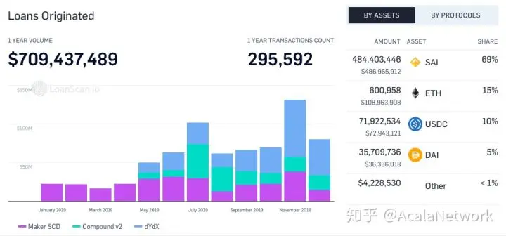根据 LoanScan 的贷出统计,截至12月25日,Maker、CompoundV2 和 dY/dX 最近一个月的贷出总额约为7094万美元,交易次数约为2.96万次,平均每笔贷出约为2400美元,较于年中上升12个百分点。