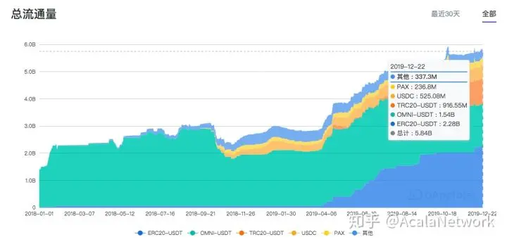 2019年,稳定币的总市值增长了约50%,从33亿美元增至50亿美元以上,其中Tether的主导地位达到了约80%。其中来自CELO、Velo、ACA 等新稳定币的出现、传统金融从业者的加入,多抵押资产作为抵押品,以及全球负利率环境下对收益率的渴望增大都会导致稳定币市场的持续扩大。