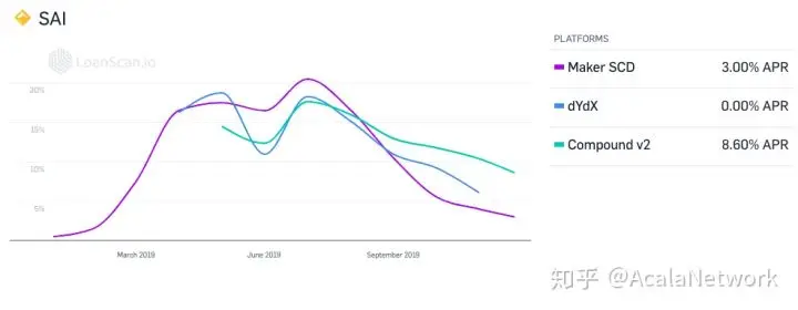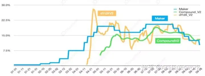 聚焦近三月的 Maker 借款利率从 20.5%的高点调整至 10.5%,截止目前12月26日借款利率为 4.0%,当 Maker 连续下调借款利率,CompoundV2、dYdX_V2 的借款利率和 Maker 逐渐趋于相近,Maker 作为 DeFi 借贷市场的“央行”,2019年对借贷市场有着绝对的调节作用。
