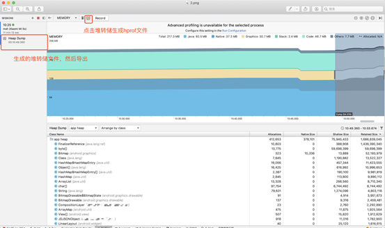 操作待分析的页面(打开该页面,在该页面尽可能操作所有功能,然后退出页面,执行GC操作,现在堆里没有被回收的有关该页面的数据,就和可能是内存泄漏),然后用Memory Profiler堆转储,然后用MAT工具打开hprof文件进行分析。