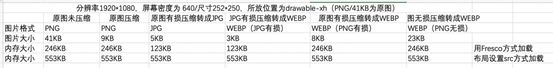 3.用Fresco方式加载图片的情况下,如果是PNG(不管是否压缩过)或者PNG转成的WEBP(不管是有损压缩转换还是无损压缩转换),加载到内存的大小都为246KB,这是因为每个像素的大小都是4字节,所以内存大小=252*250*4/1024=246KB。
