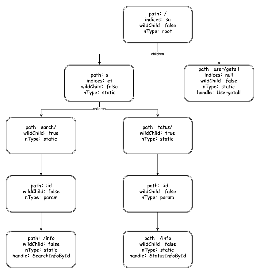 httprouter使用radix tree(前缀树)对请求的URL进行管理,最差时间复杂度为O(n),n为URL长度。