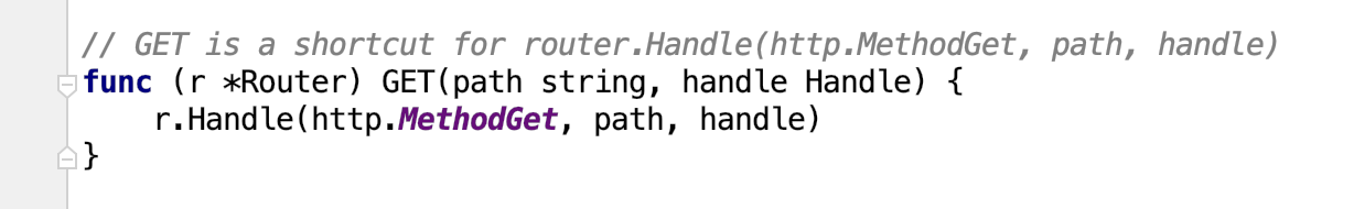 当调用GET添加路由时,走的是Router的Handle方法。同样,post、put、delete等也是一样