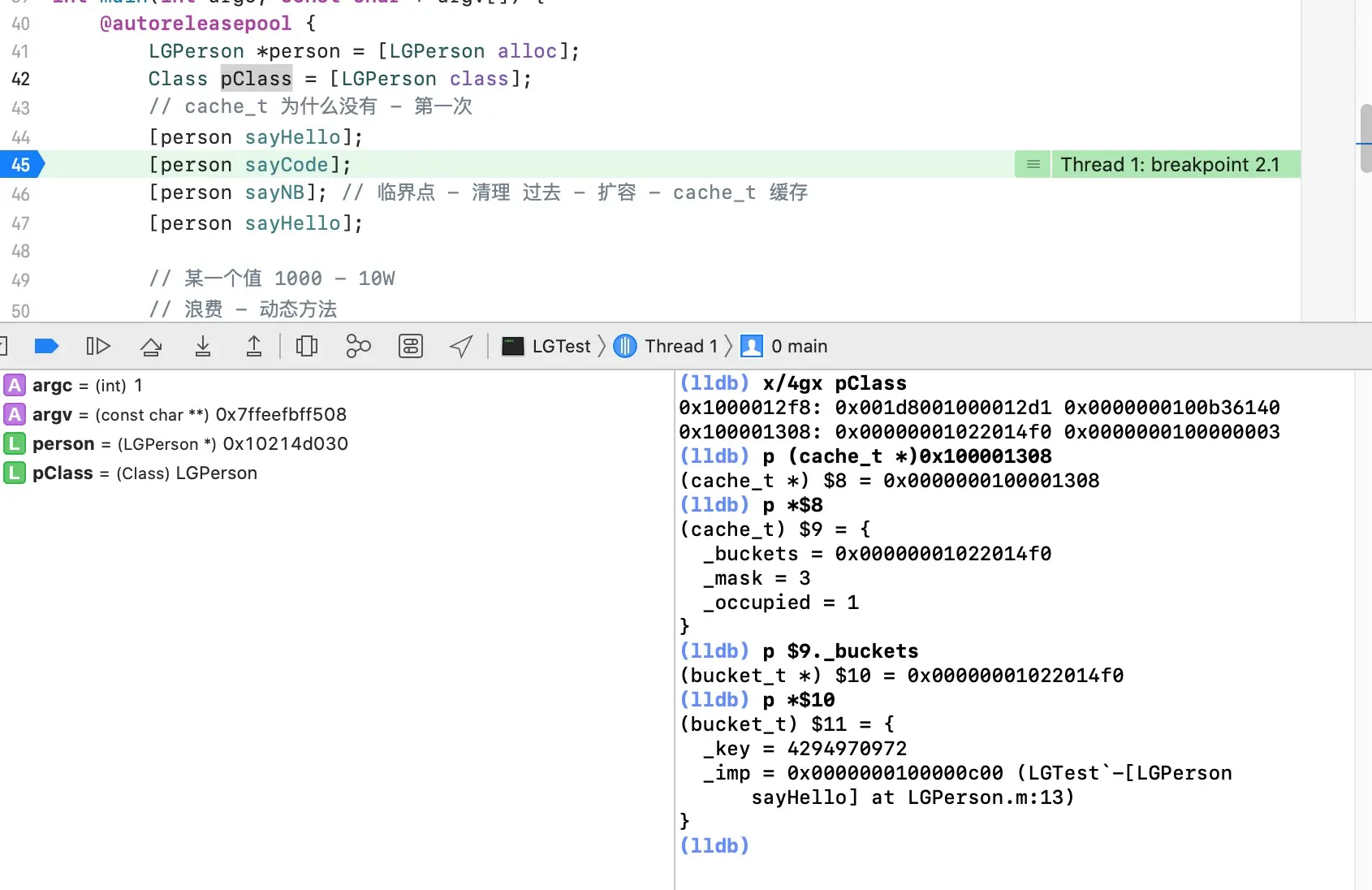 此时可能会有些人疑问,明明调了alloc和class的方法为什么缓存里没有东西,其实如果看过上篇文章朋友就会知道这些方法是类进行调用的,存在元类的缓存区里.而断点打在sayHello上还没来得及缓存,下面我们把断点打在sayCode上 .