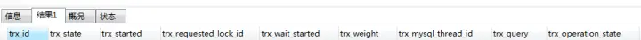 SELECT * FROM INFORMATION_SCHEMA.INNODB_TRX;--查看正在被锁的事务kill trx_mysql_thread_id;--(上图trx_mysql_thread_id列的值)死锁是一个很复杂的话题,此处只能简而言之,后续会写一篇专门讲解死锁的文章。