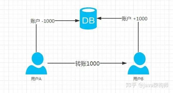 如图所示用户A给用户B转账1000,A账户-1000,B账户+1000,这个操作是一个原子操作,是不可分割的,要么同时成功,数据库中A-1000,B+1000,要么同时失败,操作回滚,数据库中数据不变。