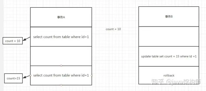 第一步,事务A获取到id=1的count=10,第二步,事务B将id=1的count修改成了15但是没有commit,第三步,事务A又获取了一遍id=1的count的值,发现此时count=15,第四步,事务B回滚后,count又变成了10,但是事务A却已经读到脏数据count=10。