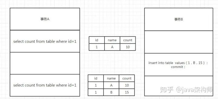 如图所示,事务A在第二次读取到了事务B新增并且已经commit的数据,所以在第二次事务A读到两条数据,这个结果就叫做幻读。