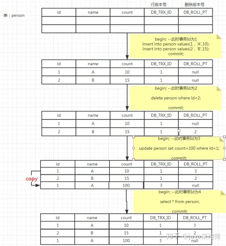 上述就是整个mysql中MVCC的新增,修改,删除的逻辑流程,可能比较复杂,需要好好体会。