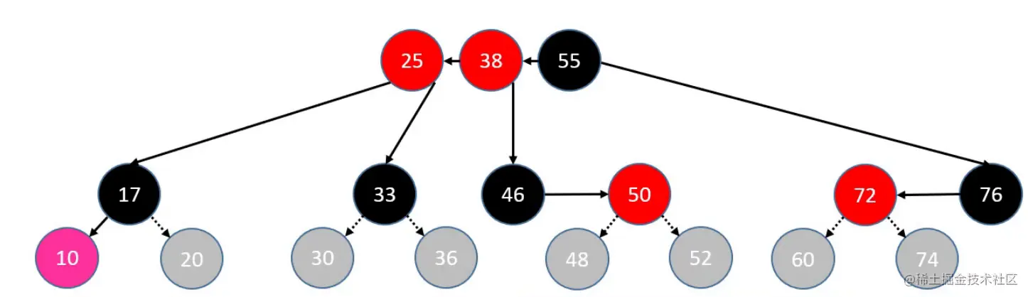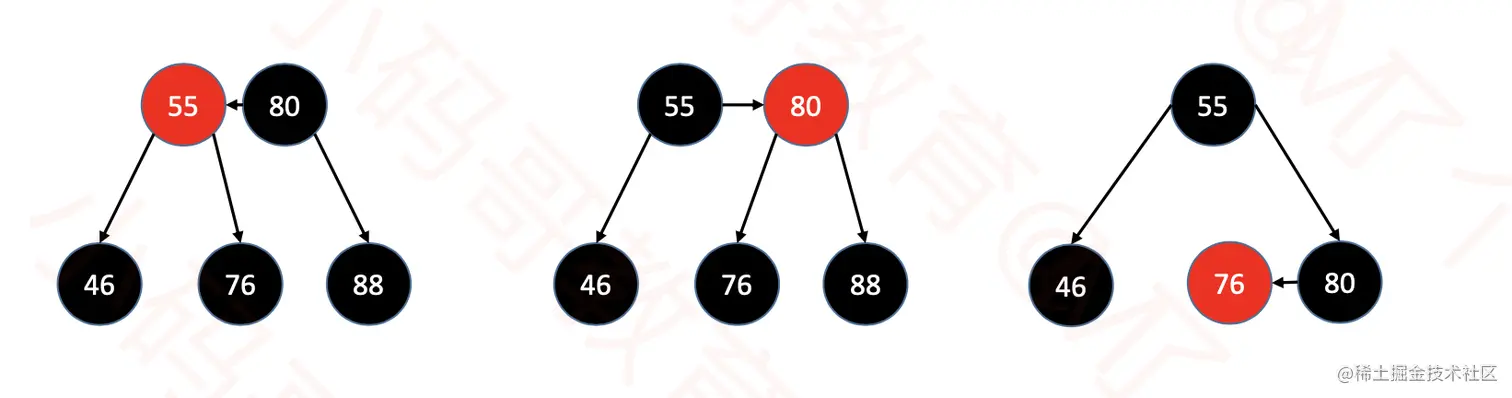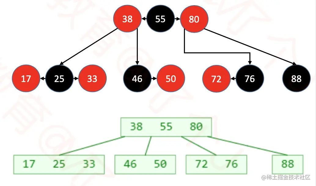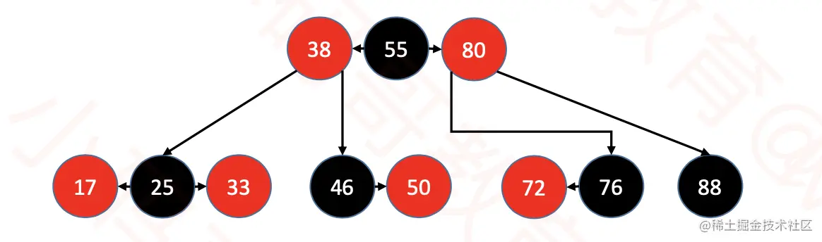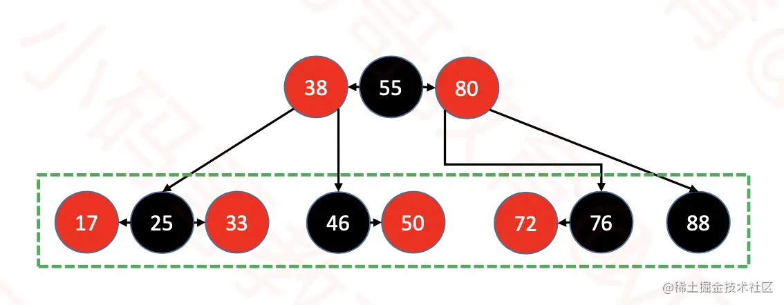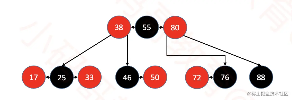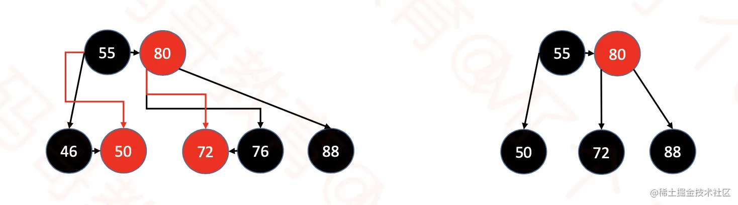 BLACK叶子节点被删除后,会导致B树节点下溢(比如删除88)。