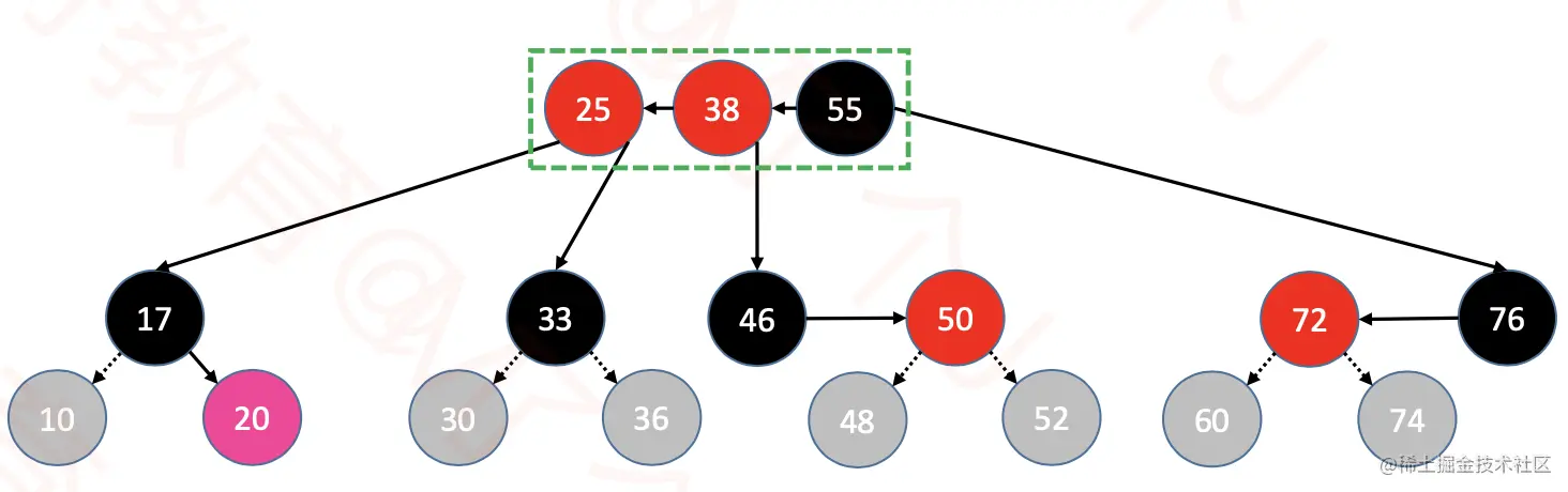 2个RED子节点的BLACK节点,例如25。- 不可能被直接删除,因为会找它的
