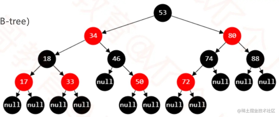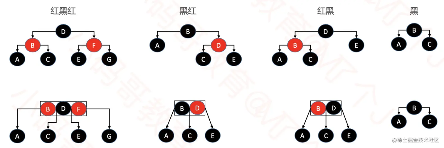 红黑树和4阶B树具有等价性。BLACK节点与它的RED子节点融合在一起,形成1个B树节点。- 红黑树的