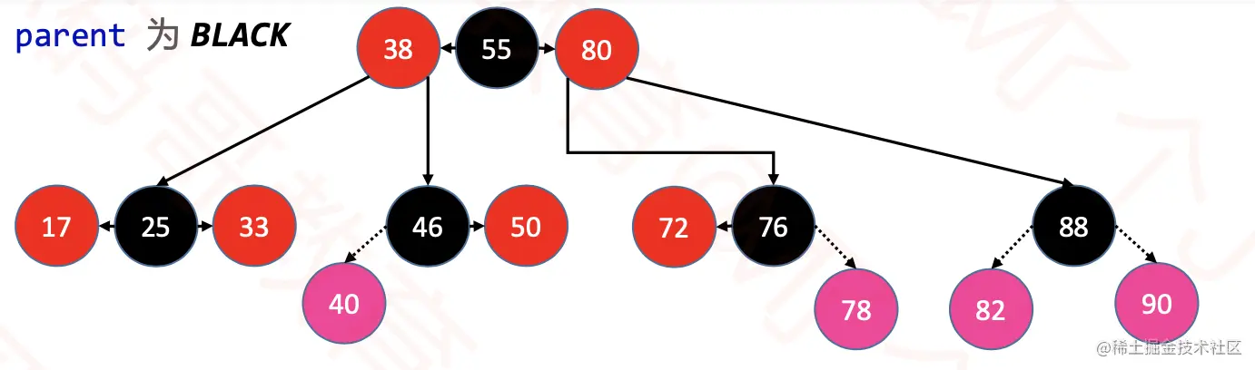 4种情况满足红黑树的性质4:parent为BLACK。 - 并且同样也满足