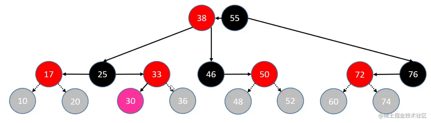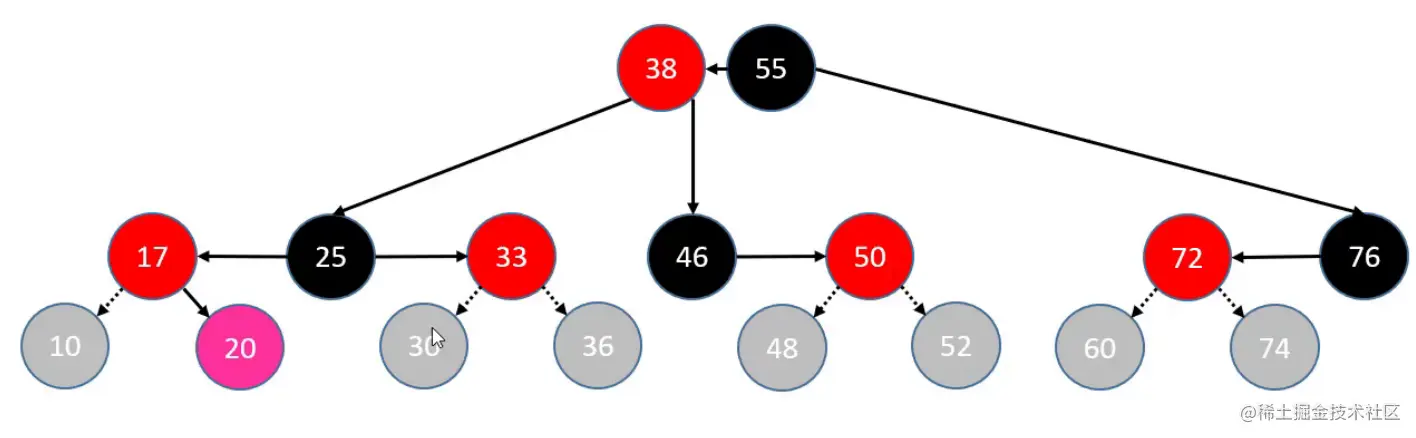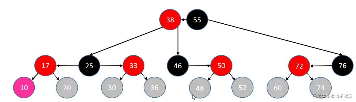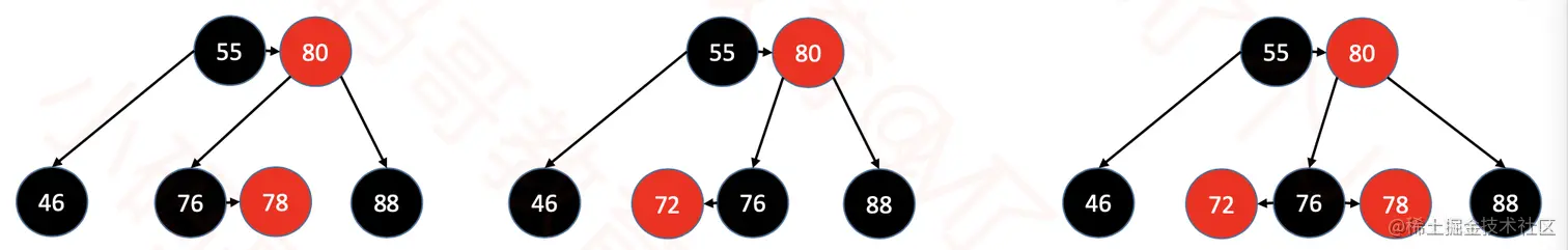 新元素必定是添加到叶子节点中,所以红黑树的添加一共有12种情况,分为17的左右,33的左右,46的左,50的左右,72的左右,76的右,88的左右。 - 其中