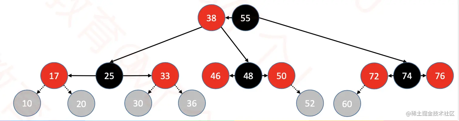 节点是RED或者BLACK根节点是BLACK叶子节点(外部节点,空节点)都是BLACKRED节点的子节点都是BLACKRED节点的parent都是BLACK- 从