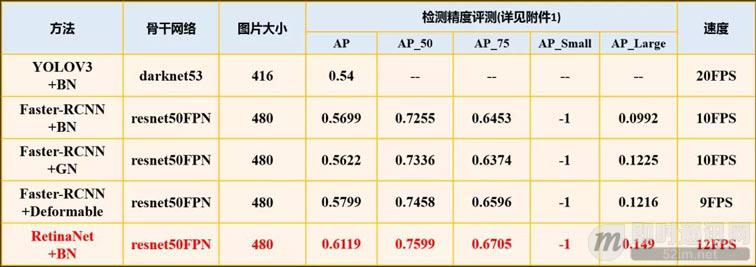 我们将 retinanet-resnet50fpn 和经典的单阶段检测器 yolov3,和两阶段检测器 faster-rcnn-resnet50-fpn 进行对比,如下表格 20 所示。评测数据采用的是外包采集的 7k 张图片,涵盖了 11 大类,对比表格结果可知,retinanet 在速度和精度上达到了很好的折中效果。后续我们会通过 tensorRT 进一步优化 retinanet 的前向速度,剧透下最快可以达到 80FPS。