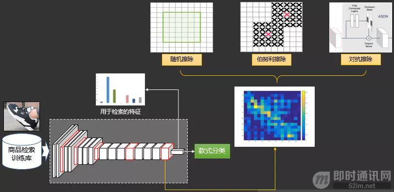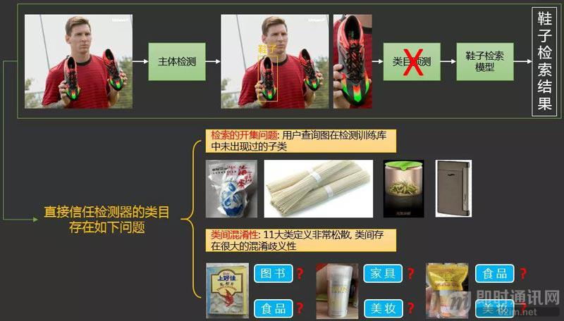 弱监督检测标注:该算法的核心思想是标注图片中所含物体的类别相比标注框+类别的时间成本要低很多,如何只利用全图类别信息来自动推断物体的位置信息,从而完成自动检测标注呢?学术界和工业界有大量的研究者对这一方向进行了研究和探索,主要思路都是挖掘图片中的局部显著性区域,用其来表征全图的类别语义信息,如图 9 列举了几篇代表性文章。图 9 左下角算法重点阐述下,它是业内第一篇用深度学习来做弱监督检测的文章,实验室师兄研发,我们还基于该算法参加过 ImageNet14 的竞赛,拿了一个小分支的冠军。尽管愿景很美好,弱监督检测算法有个严重的缺陷,就是很容易拟合到局部区域,比如从大量猫的图片中拟合到的位置是猫脸区域,而很难定位到完整的猫的位置,这对于我们同款商品检索来说是难于接受的,我们需要精确召回同一款商品(细粒度检索),所有信息量都非常重要,因而该算法基本被我们 pass 掉了。