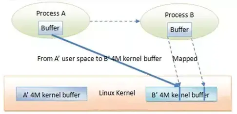 传输效率高、可操作性强: 传输效率主要影响因素是内存拷贝的次数,拷贝次数越少,传输速率越高。从 Android进程架构角度分析:对于消息队列、Socket 和管道来说,数据先从发送方的缓存区拷贝到内核开辟的缓存区中,再从内核缓存区拷贝到接收方的缓存区,一共两次拷贝,如图: