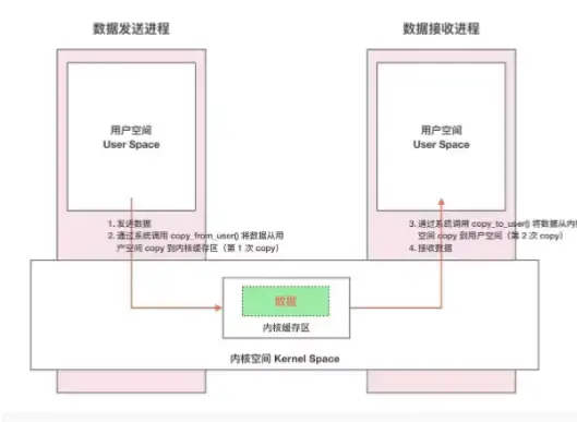 copyfromuser()将数据 copy 到内核中的内核缓存区,由于内核缓存区和接收进程的用户空间存在内存映射,因此也就相当于把数据发送到了接收进程的用户空间,这样便完成了一次进程间的通信。