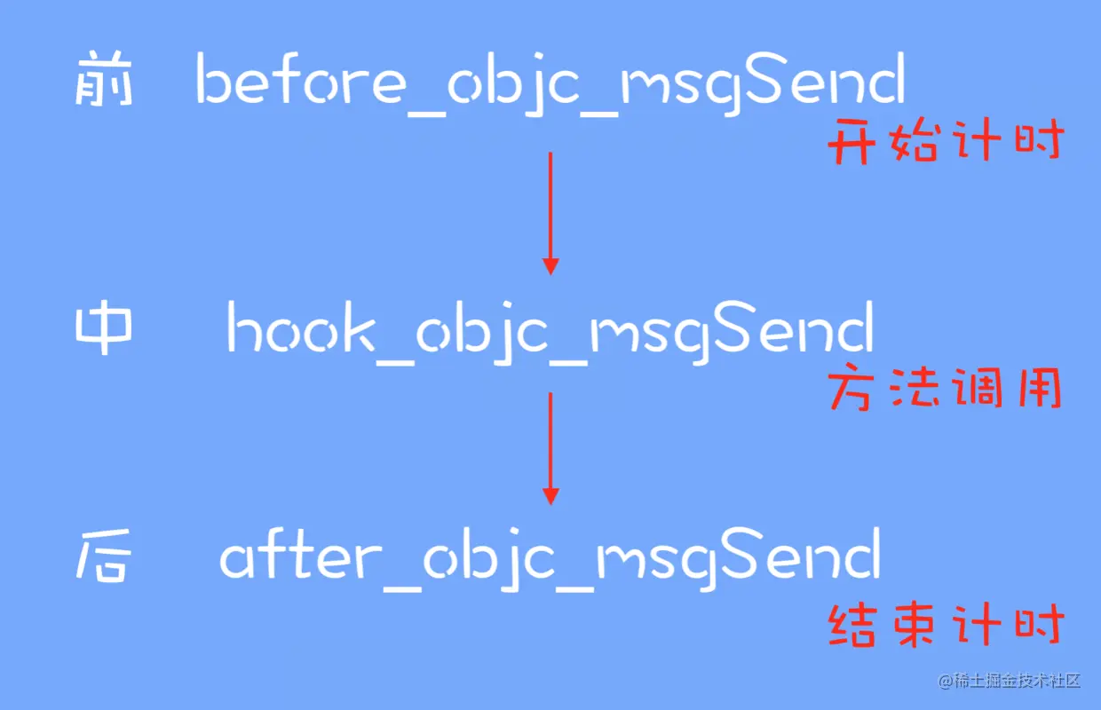 我们的目的是:通过hook原objc_msgSend方法,在objc_msgSend方法前调用打点计时操作,在objc_msgSend方法调用后结束打点和计时操作。通过计算时间差,我们就能精准的拿到方法调用的时长。