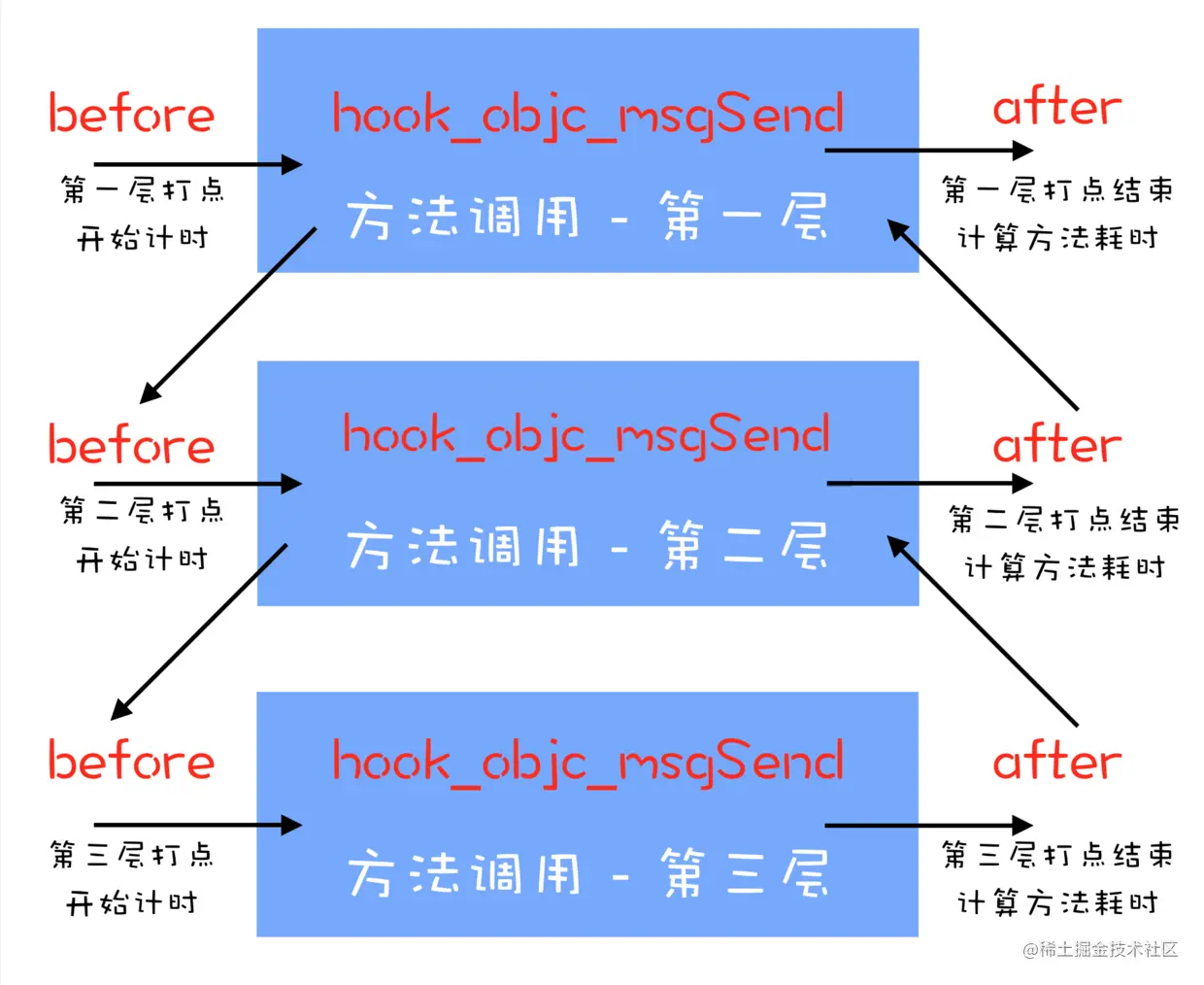 这时候,每当底层调用hook_objc_msgSend方法时,会先调用before_objc_msgSend方法,再调用hook_objc_msgSend方法,最后调用after_objc_msgSend方法。