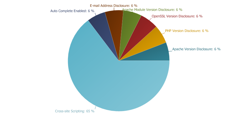 其中,所占攻击比重最大的是 跨站点脚本攻击(XSS), 占总体攻击的 40%,紧接着是SQL注入24%,cross-section为7%,本地文件包含4%,分布式拒绝服务(DDoS)为3%