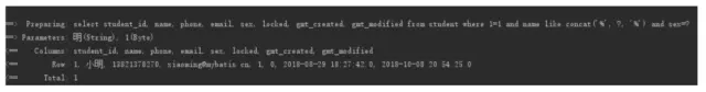 selectfrom studentand name like concat('%', #{name}, '%')and sex=#{sex}