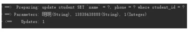 Student student = new Student(); student.setStudentId(1); student.setName("明明"); student.setPhone("13838438888"); System.out.println(studentMapper.updateByPrimaryKeySelective(student));sqlSession.commit(); sqlSession.close(); }
