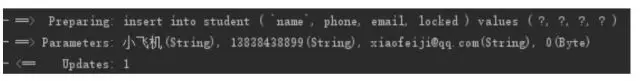 Student student = new Student(); student.setName("小飞机"); student.setPhone("13838438899"); student.setEmail("xiaofeiji@qq.com"); student.setLocked((byte) 0);System.out.println(studentMapper.insertSelective(student));sqlSession.commit(); sqlSession.close(); }