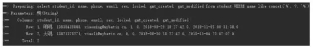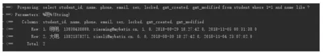 Student search = new Student(); search.setName("明");System.out.println("只有名字时的查询"); List<Student> studentsByName = studentMapper.selectByStudentSelectiveWhereTag(search); for (int i = 0; i < studentsByName.size(); i++) { System.out.println(ToStringBuilder.reflectionToString(studentsByName.get(i), ToStringStyle.MULTI_LINE_STYLE)); }search.setSex((byte) 1); System.out.println("姓名和性别同时存在的查询"); List<Student> studentsBySex = studentMapper.selectByStudentSelectiveWhereTag(search); for (int i = 0; i < studentsBySex.size(); i++) { System.out.println(ToStringBuilder.reflectionToString(studentsBySex.get(i), ToStringStyle.MULTI_LINE_STYLE)); }System.out.println("姓名和性别都不存在时查询"); search.setName(null); search.setSex(null); List<Student> studentsByNameAndSex = studentMapper.selectByStudentSelectiveWhereTag(search); for (int i = 0; i < studentsByNameAndSex.size(); i++) { System.out.println(ToStringBuilder.reflectionToString(studentsByNameAndSex.get(i), ToStringStyle.MULTI_LINE_STYLE)); }sqlSession.commit(); sqlSession.close(); }