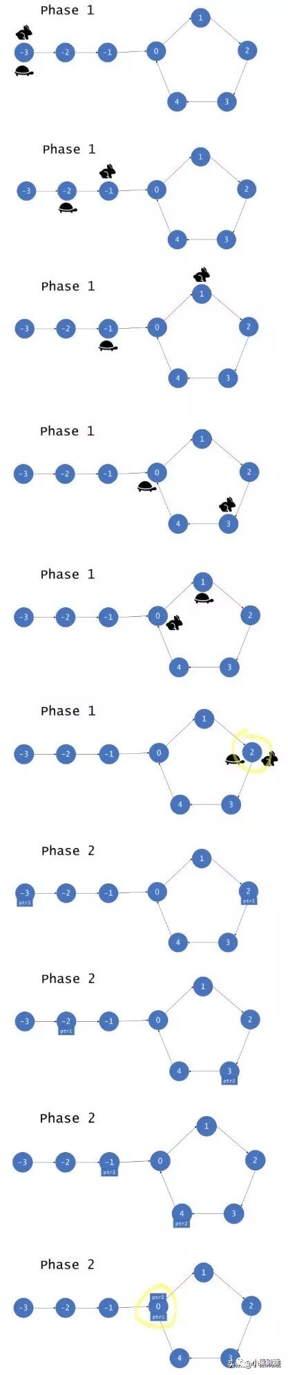 // 重置快指针, 然后各自都移动1位,再次相遇的地方就是环入口