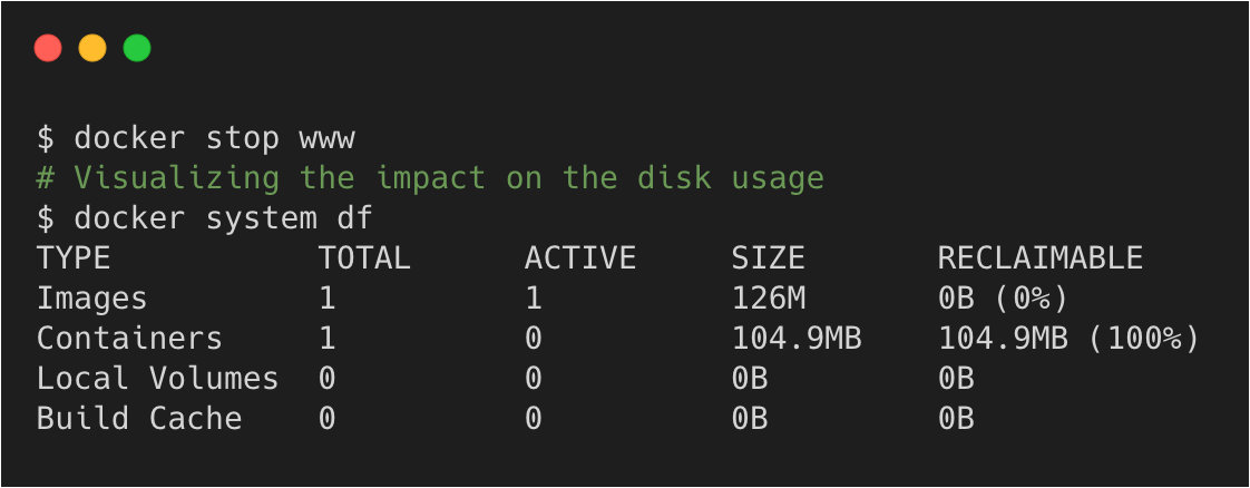当停止容器后,容器占用的空间就会变为可回收的: