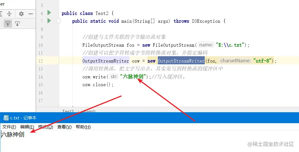 //调用转换流,把文字写出去,其实是写到转换流的缓冲区中