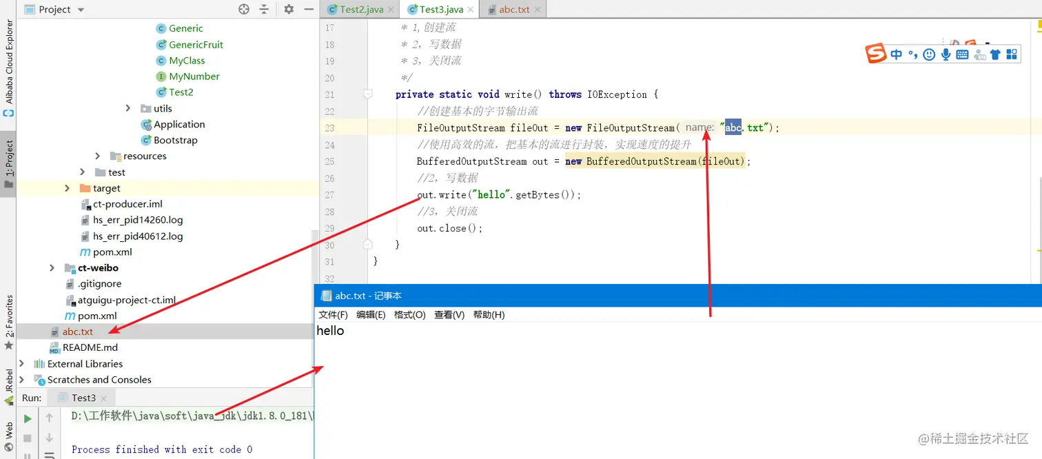 public static void main(String[] args) throws IOException { //写数据到文件的方法 write(); } /* * 写数据到文件的方法 * 1,创建流 * 2,写数据 * 3,关闭流 */ private static void write() throws IOException { //创建基本的字节输出流 FileOutputStream fileOut = new FileOutputStream("abc.txt"); //使用高效的流,把基本的流进行封装,实现速度的提升 BufferedOutputStream out = new BufferedOutputStream(fileOut); //2,写数据 out.write("hello".getBytes()); //3,关闭流 out.close(); } -