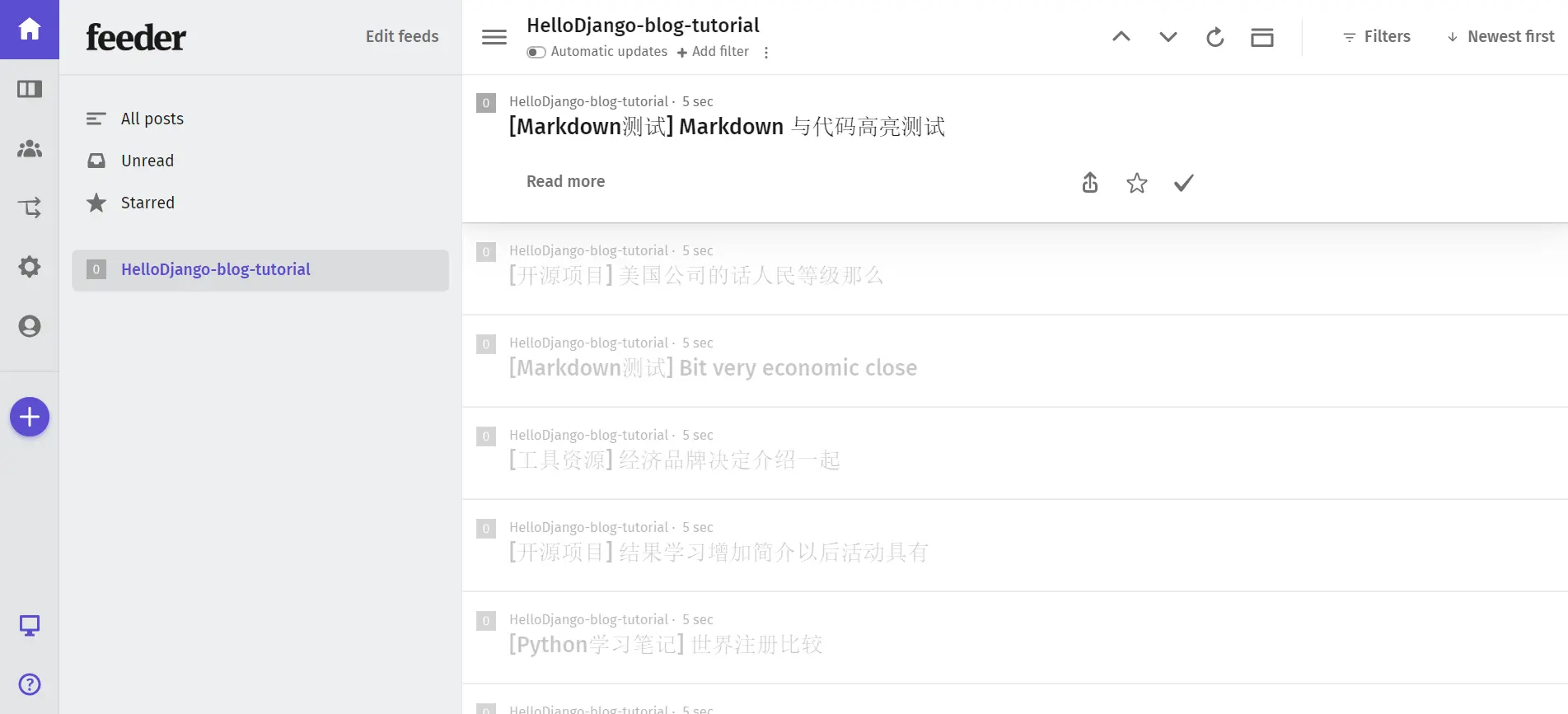 可以看到订阅成功了,订阅界面显示的信息就是我们在 AllPostsRssFeed 类中指定的相关信息。大功告成,现在任何人都可以订阅我们的博客了!